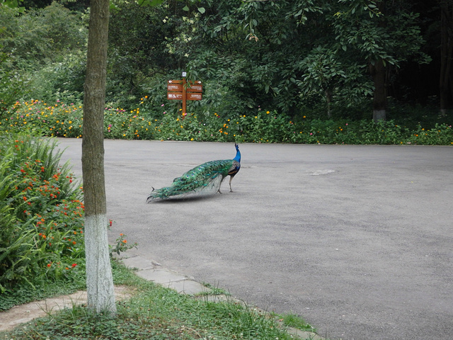 走在路上,看见了一只孔雀。一点都不怕生,带着特别的傲娇在散步。