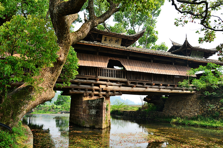 玉沙桥坐落于四堡乡马屋村口的花溪河上,相传昔日花溪河之沙石,晶莹闪烁若玉石,故名玉沙桥。这座桥始建于清康熙年间,距今已有三百多年历史,是座风雨桥,上有遮雨伞篷,行人能在此避风躲雨。桥面砌以大小如一的鹅卵石,两旁栅以栏杆,首尾中间均有小阁。桥头匾书“朗朗上行”,桥尾匾书“活活回映”,桥中匾书“玉沙桥” 。桥基为水成岩石鳌墩,上架有枕木为斗拱式托住桥身,桥两端古树参天,高低错落,精致美观,景致清幽。