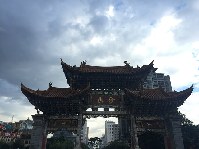 长水机场出来就有5条直达昆明市内各个景点的空港快线和两条专线(昆明火车站&西部客运站),坐的是空港2号线,到锦江酒店下,直走300米就到了昆明火车站,大概坐了一个小时左右。然后去自动售票机领了在网上提前买的火车票,所以还有时间去昆明市中心玩一下,于是走到外面打车去市中心逛逛。外面有公交车,的士,摩托车,摩托三轮车。坐的是摩托车,因为比较快,十几分钟吧,到了金马碧鸡坊。