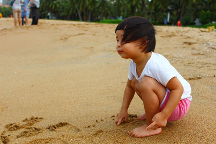 常常说三亚湾的沙滩比不上大东海,大东海又比不上亚龙湾。但在我看来,这里的沙滩虽然粗砺,不过好在生动,起得早可以看到有人在海边渔鱼。沙滩里也有很多小贝壳,小七在这里反倒是玩得最起劲的。一直在脚下的沙子里寻觅,到回去的时候,手里默默抓了一大把。回到公寓便摆了一桌子,得意地数了好久。