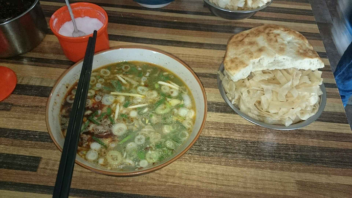 洛阳特色早餐,左边是一碗驴肉汤可以把面泡里面吃,5块就可以,10块的比6块多不了多少