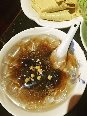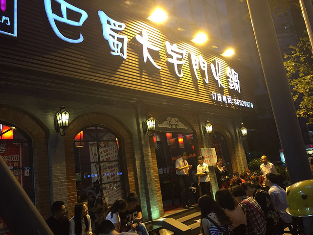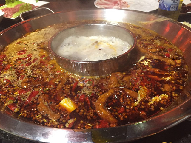 然后我们打车(10元)去了巴蜀大宅门火锅,到了之后取号排队,排队的时候我和大亮亮就把兔头解决掉了,哈哈,实在是太想吃了~好不容易排到啦,一进去全是人,当然,还有各种美女,亮哥看的都停不下来了~第一次吃成都火锅,这边是沾着香油,里边加蒜吃的,味道爽歪歪了,亮哥被辣的脸都成了猪血色了,依然吃的停不下来!我们两个人点了好多,才195,我觉得不贵,重点是味道实在是太棒了!!!推荐鸭肠、牛肚,他那儿还有个酸梅汤冰粉,非常好吃又解辣,严重推荐!