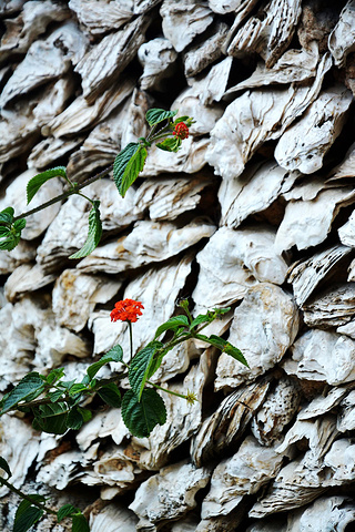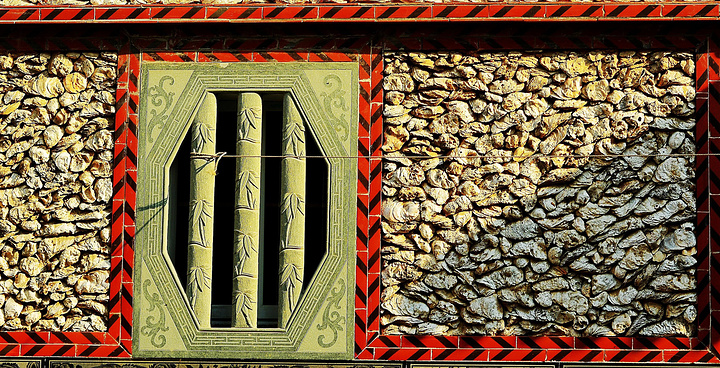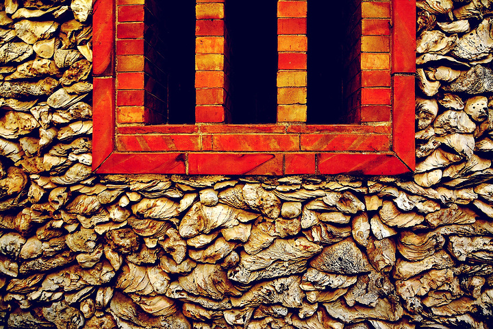 建筑师们这些将大而中空的蚵壳垒砌在墙面,墙里隔绝空气多,这样的墙冬暖夏凉。在沿海的海风里具腐蚀性的盐分,也奈何它不得,长年累月的风雨还将它们洗刷得格外明丽。