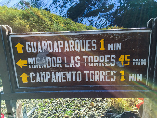 走了三个小时之后到达第二个营地,路边立着下面的这个牌子,上面标示到三塔的终点还有45分钟的路程,但也是最难走的一个部分。前面提到因为积雪被关闭的也是这最后的一段。没有任何提示说封路,我们感觉非常庆幸,至少没有白在半夜里奔了三个小时,拿出三明治和水补充了一下能量为最后的登顶作准备,但后来我们实际用了快两倍的时间才把这段路完成。