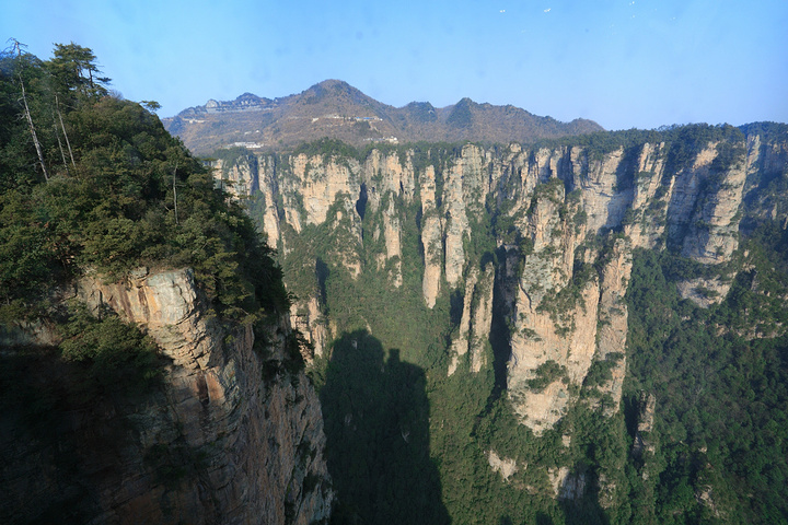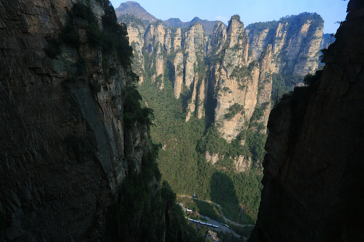 这是在天梯里拍的照片,对面的群山叫神兵聚会,宏伟壮观,是张家界地貌峡谷峰林风光的典型代表。