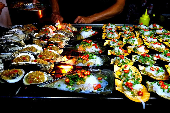舟车劳顿,在三亚小脚丫海景公寓休息了一会,不知不觉都要到吃完饭的时间了。在小脚丫小陈老板的推荐下,我们奔向第一市场开始了在三亚的第一餐。正在烧烤的蒜蓉生蚝+扇贝粉丝,看的简直流口水。