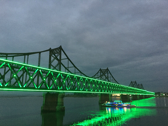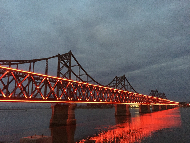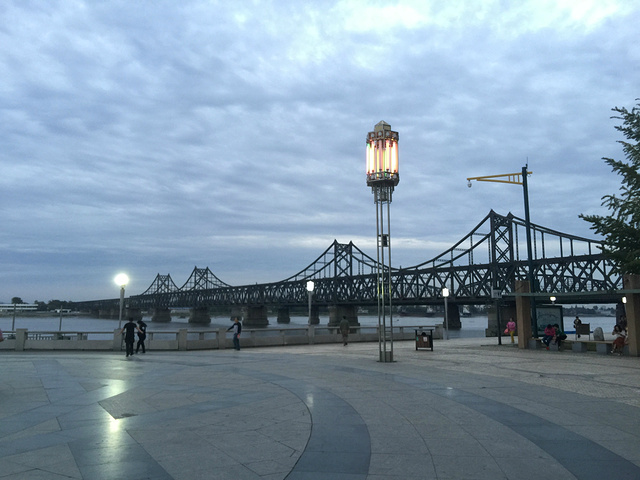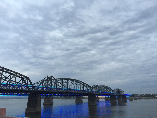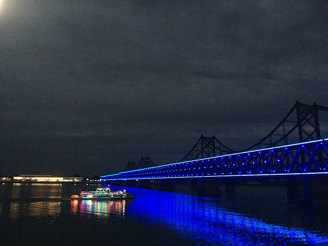 到达鸭绿江公园,天色未黑,傍晚的江边静谧安逸。断桥让人们铭记历史,珍惜现在,为中国现在的繁荣强大而欣慰自豪。华灯初上,大桥和游船也亮了起来,现代、美好,构成了与白天凝重历史截然不同的风景。