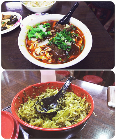 如在家乡四川一样,牛肉面有大中小碗选择,面同样有粗细选择,很是贴心,而如果你不想吃面,也有单纯的牛肉汤可以喝。而再看看这一大碗酸菜便会明白,为何方便面厂家会出老坛酸菜牛肉面,因为酸菜才是牛肉面的最佳佐食,台湾的酸菜没有四川的那么咸,不过同样酸爽可口,让满是红油的牛肉面多了一份独特的滋味。