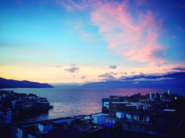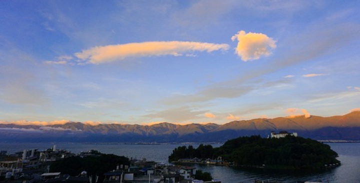 晚上最佳的观景点应该是五华楼登顶,前倚洱海,背靠苍山。夕阳映照着洱海上空泛着粉色的云团,背后苍山的浓云无论阴晴早晚,都有一种压抑的阴沉感,整个云团覆盖了苍山每一个山峰,低得触手可及,就连云雾由上至下的翻滚都清晰动人。苍山洱海就像两重天,中间的大理城是条低调亲切的分界线。