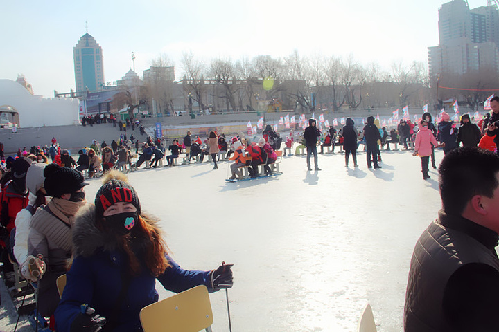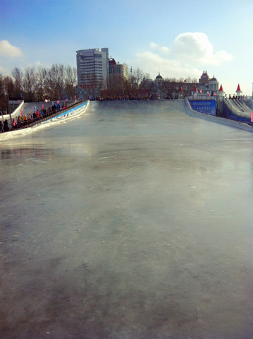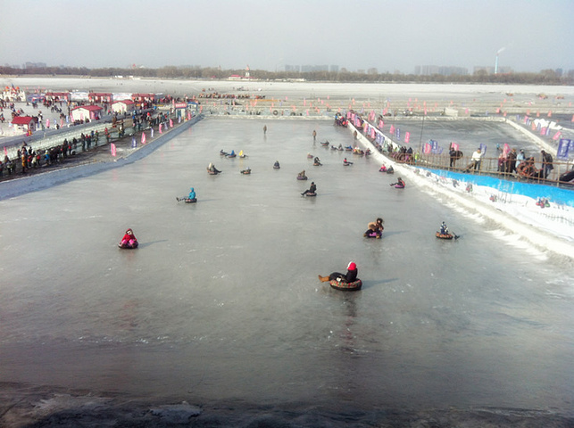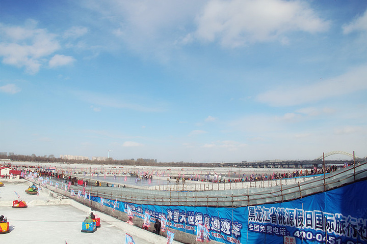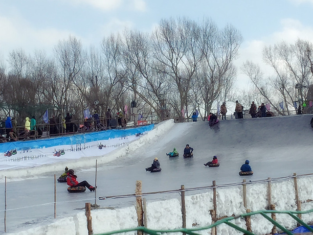 “冰雪欢乐谷”在松花江的堤坝上,这里的冰雪游乐设施都是由人工打造建成。