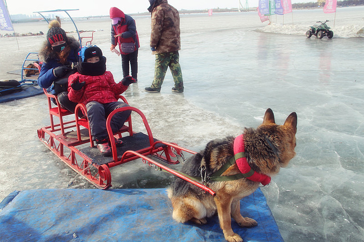 狗拉爬犁是东北的一个特色娱乐项目,在松花江上滑动也是一种特别的体验!