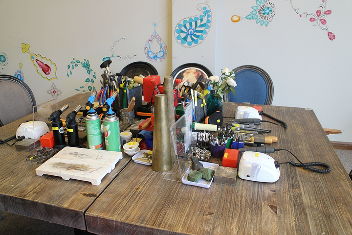 满墙华丽丽的珠宝手绘,桌面上整齐堆放着制作手工银饰的工具。看到这些工具就手痒痒想要做手工。据说做一个戒指只要一个多钟头,并不着急回上海,我也自己做了一个。