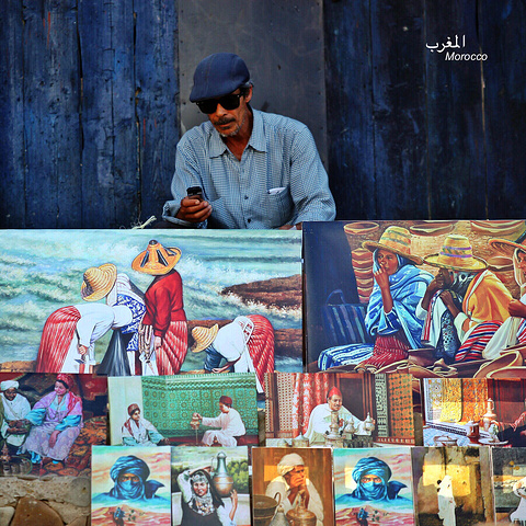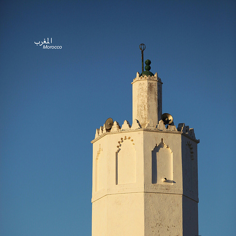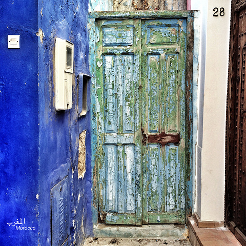 因为艾西拉很小,而且8点半才会天黑,午饭后一直睡到下午4点才出门。麦地那就在海边,走进麦地那,还能听到海的声音。一开始的房子清真寺全是干净的白色,在蓝天下分外圣洁。走进深处,我们慢慢发现墙上画了很多漂亮的壁画,美得把我和高兴都惊呆了。心中只有无数的感激和感叹:哎嘛(请用小沈阳的语气读)!这摩洛哥到底是怎么了!