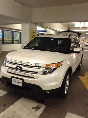 行李,直奔租车公司,在一个月前,通过Carrentals.com预定了Burget一辆TOYOTA的Rav4。出门穿过停车场就能找到好长一排租车的指示牌,只要沿着指示,就能很容易的找到自己的租车点。站在Burget柜台里两个帅哥长着东方的脸,却连一句普通话都说不来(不是说到了温哥华,不会英语只要说普通话也能走遍吗? 切!),不会说普通话的东方帅哥看了我们的行李,建议我们换辆行李空间更大的车,就在介于中文和英文混淆表达的半小时后,终于谈妥了价格,我们的坐骑换成了7人座的FORD的Limited。 车子开来后,哇!好漂亮的一辆车。按下按钮,后排的两个座位自动平放后形成的行李空间刚好放下我们的那一堆行李。赞! 原先所担心的行李问题彻底解决啦。