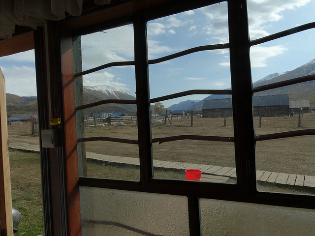 我们坐在院子里,面对着雪山吃饭。