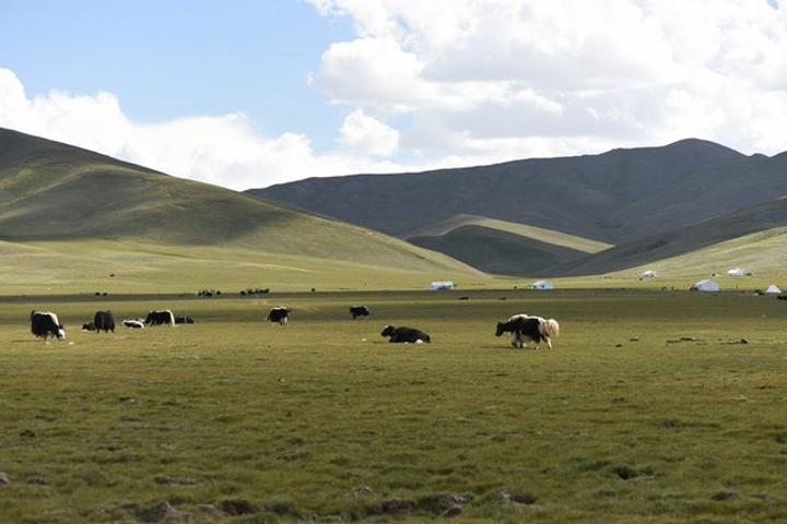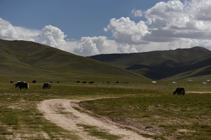 一路上风景如画,山顶上全是绿绿的草地,配上蓝天白云,还有羊群和牦牛,中间还见到一只狍子穿公路,老鼠更是经常在路边蹿来蹿去,似乎不太高兴我们扰了他们的清静。没想到湖泊到时不少,还有河流相伴,尤其是在玉树到多多峡的路上基本沿着河流行走,那河水清亮通透,蜿蜒曲折。一路走走停停,不是停下拍照,蓝天、白云、青草、牛群在各种地形的衬托下构成多变的画面。
