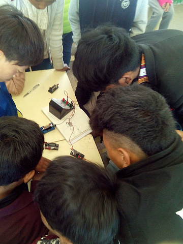 今天上午由北京十七中的几个孩子来给给学生上电学实验课,他们先讲解电路基本知识,用带来的实验设备为学生演示电路的串联和并联连接方式、开关作用、变阻器的作用,并让孩子们自己制作电路,从那帮孩子的好奇目光中看到了活动的意义。课间来自游记青海公益之旅