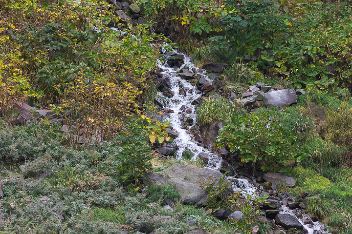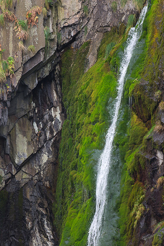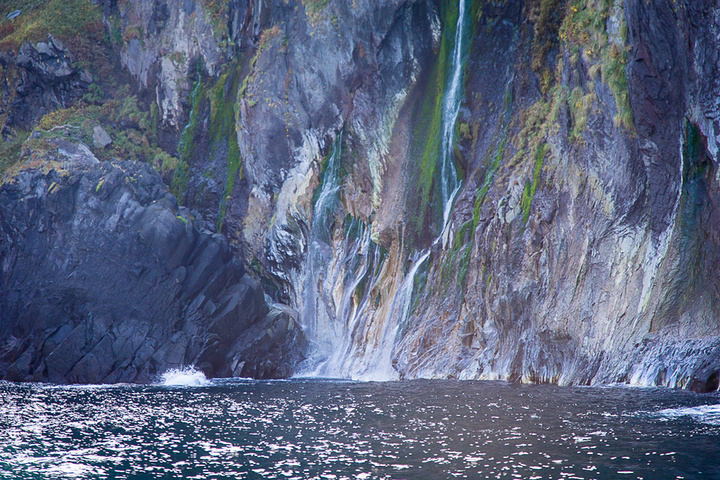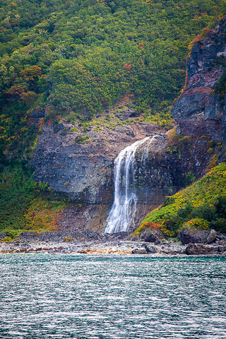 半岛的气候瞬息万变,前几分钟还是碧海蓝天,转眼就是风起云涌,天空很快就阴起来。知床半岛的海岸线受火山和侵蚀作用影响,海岸大多是悬崖峭壁,山上的一些溪水直接就顺着峭壁而下,形成了壮观的瀑布景观。中间那张瀑布当地人说像红酒杯,大家看看是不是很像?