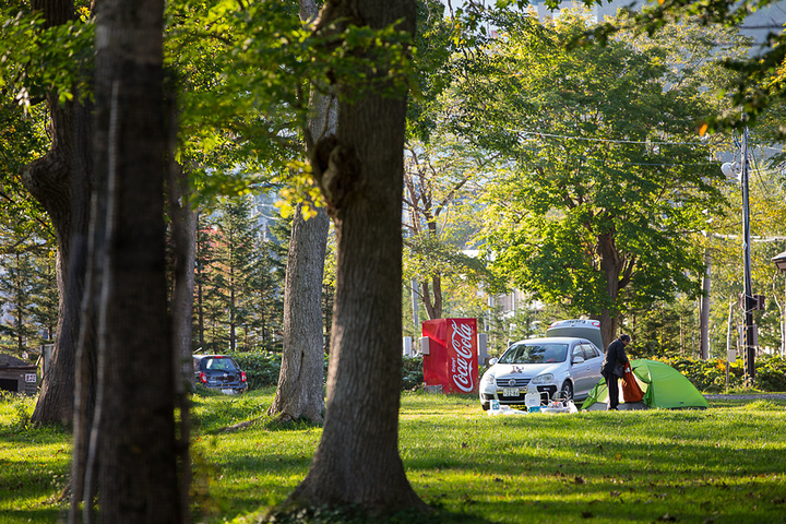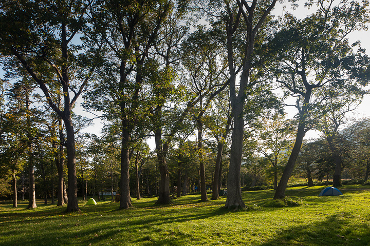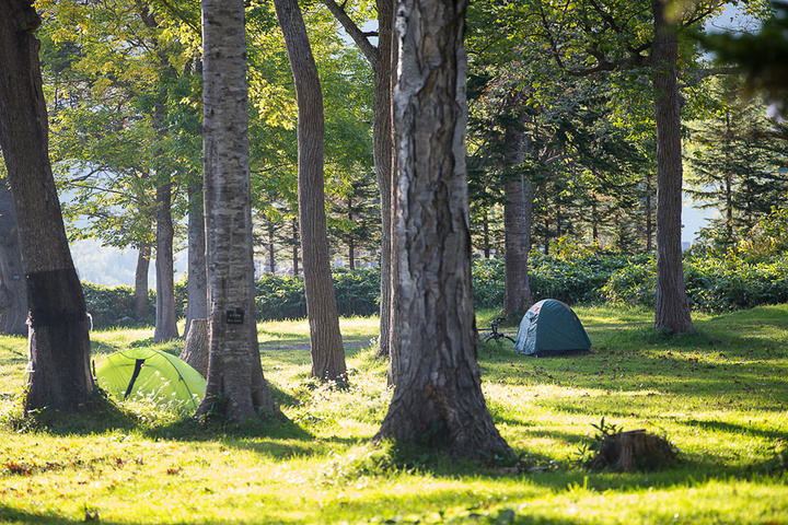 我们住在位于宇登吕南边悬崖上的知床野营场,野营场一直开到9月末,因为10月份天气转冷,不适合露营,一到10月就关闭了,我们正好赶上了九月的最后两天。野营场位于一片林地里,但是附近有温泉可以去洗澡,还有自动售货机,厕所也很干净,只要自备洗漱用品、防潮垫和睡袋,住得还是挺舒服的。野营场内就是知床八景之一的夕阳台。