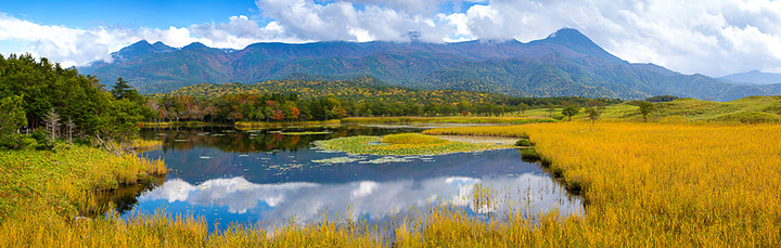 知床五湖中的一湖与知床半岛的连山,大都是活火山。单反接片全景图。
