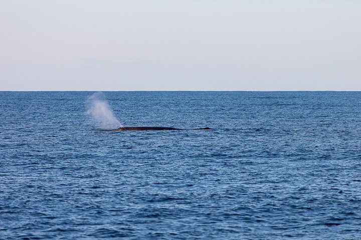 由于迟迟不见大型鲸鱼的踪影,观鲸船在海上关闭了引擎,声纳一直在忙碌的工作,确定鲸鱼的方位。不久,海平线尽头出现了向上喷起的水雾,船上的声纳也发现了鲸鱼唱歌的声音,观鲸船急速调转船头,开足马力向鲸鱼的方向疾驰。是一只巨大的抹香鲸来到水面换气,可惜鲸鱼的角度与船刚好形成了90度,我们正好对向了它的侧面,它甩尾入海的一瞬间,我只拍到了尾鳍的侧面,希望下次再来能从背面看见抹香鲸的尾鳍。