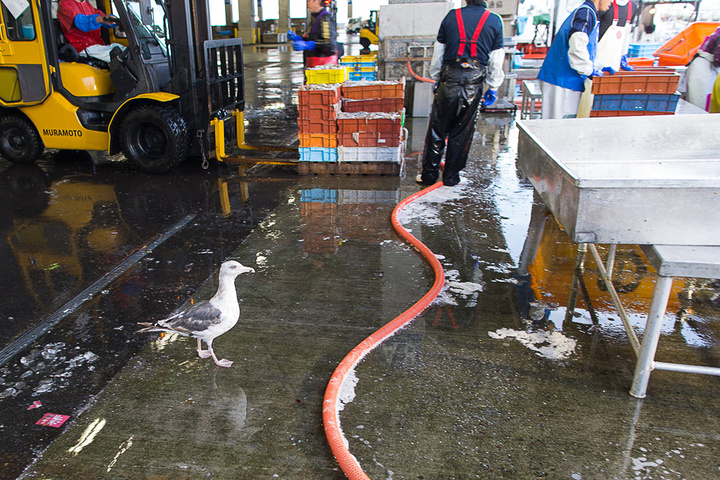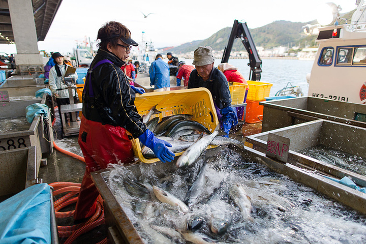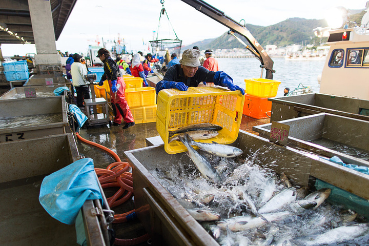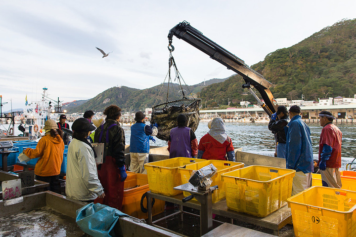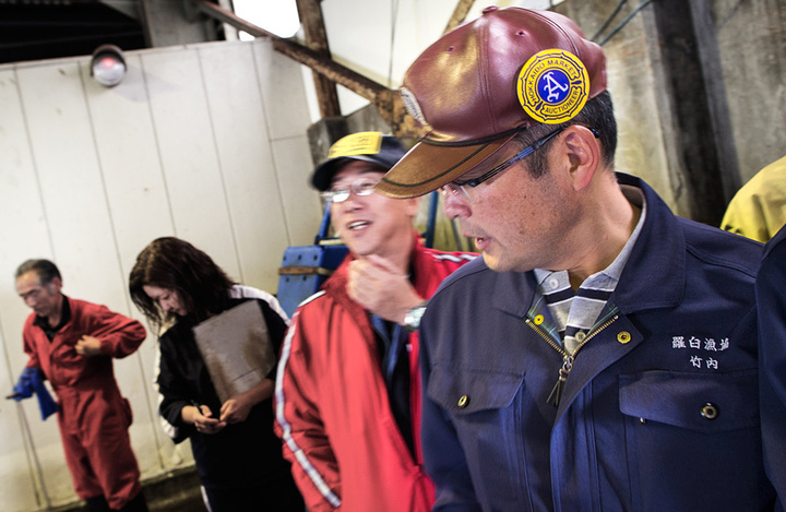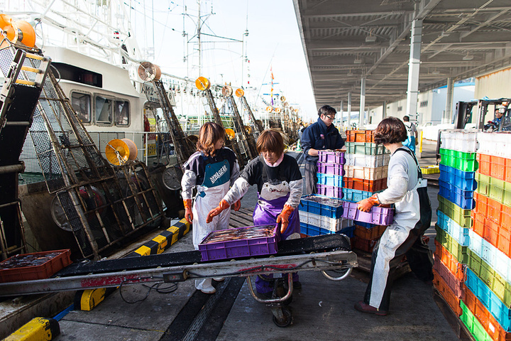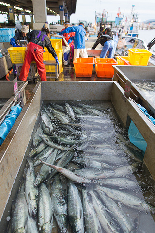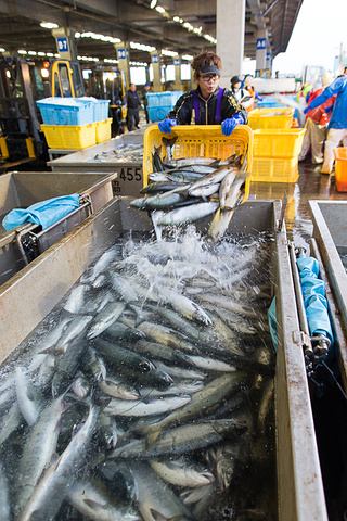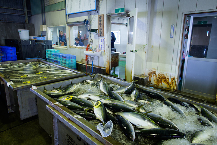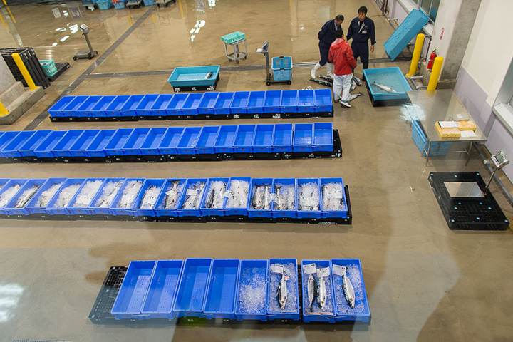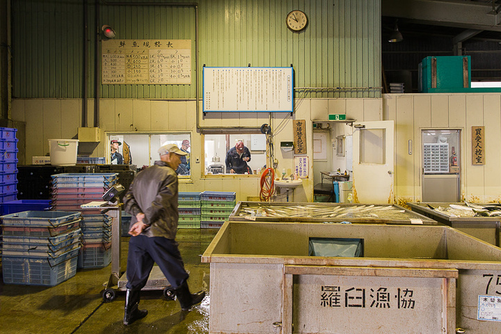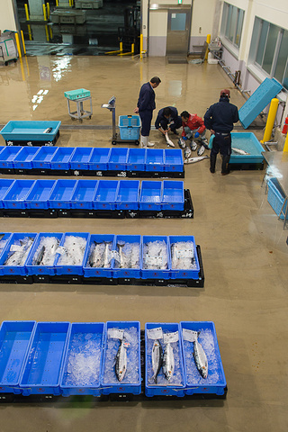 经过凌晨的忙碌,上午10点多钟,渔协组织日本各地的海鲜商人来到渔港进行拍卖,与东京不同,这边的拍卖不是往上叫,而是往下叫。