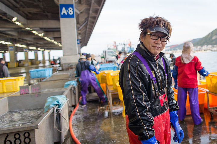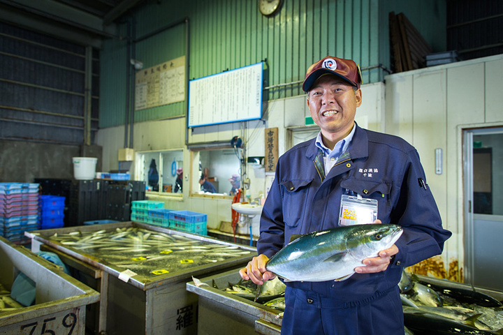 一位渔协的负责人在为我们展示鰤鱼。