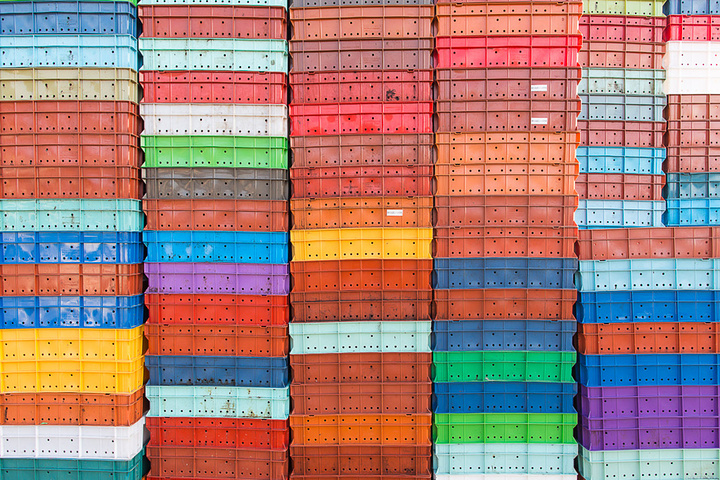 盛装鱿鱼用的塑料箱叠放在一起,形成了五颜六色的一道墙面。