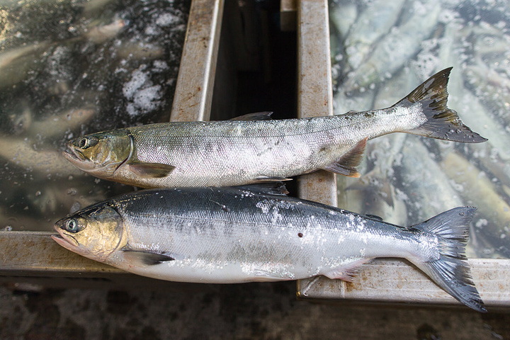 我们来到罗臼渔业协会参观,正好赶上满载鲑鱼的渔船回港,工作人员正在按照鲑鱼的品相分拣,分成好几个档,装在不同的水箱里。水箱用冰块保温,再用叉车运走。分拣时有时会发现“鲑儿”这样的极品鲑鱼,鲑儿是太平洋鲑鱼里最名贵的一种,脂肪含量比普通的鲑鱼多出20-30%,由于鲑儿洄游路线与其它鲑鱼不一样,所以不经常在北海道东部沿岸出现,它们的故乡在黑龙江乌苏里江,中文的名字就是黑龙江大马哈鱼。洄游黑龙江需要逆流游900公里,所以鲑儿的脂肪含量要远远高过普通的鲑鱼,是很正常的。
