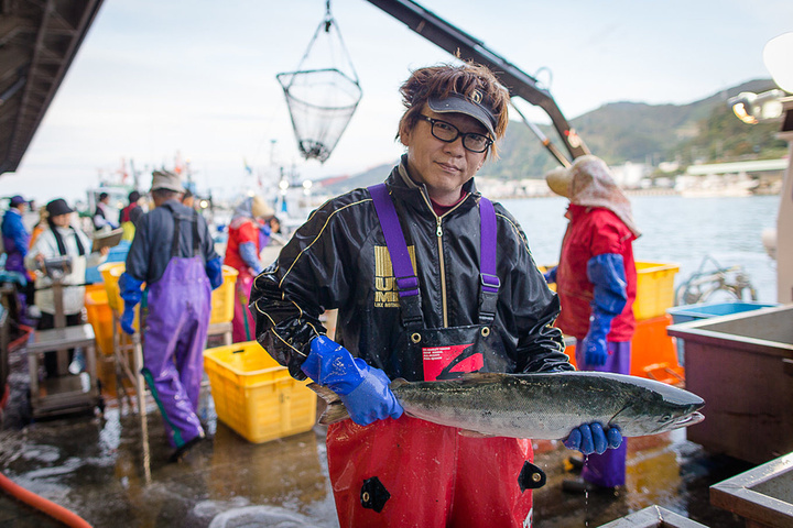 年轻有为的田中帅哥,罗臼地区规模最大的渔业公司之一的少当家,忙里偷闲给我们展示刚刚打上来的鲑儿。