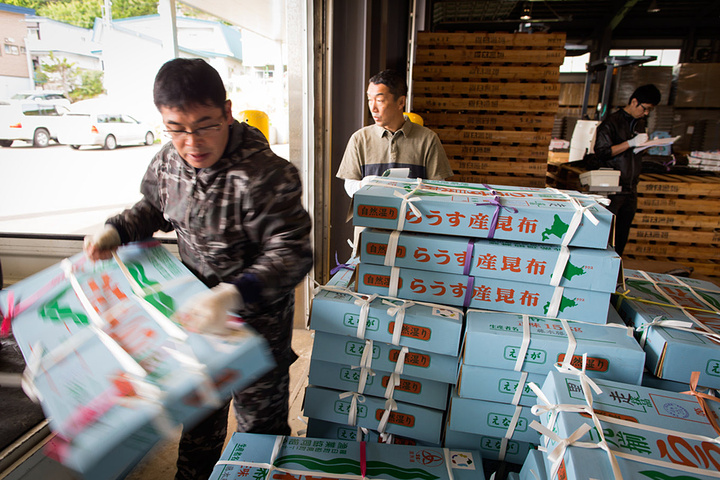 我们随后又去了海带仓库参观,昆布就是海带,在日本料理中占有重要地位,虽然一般的食客可能看不到,但昆布其实无处不在,熬汤,调味料里都会用到昆布。罗臼出产全日本质量上乘的昆布,罗臼昆布在全日本都是著名的品牌。用装箱条的颜色区别昆布的品相和价值。