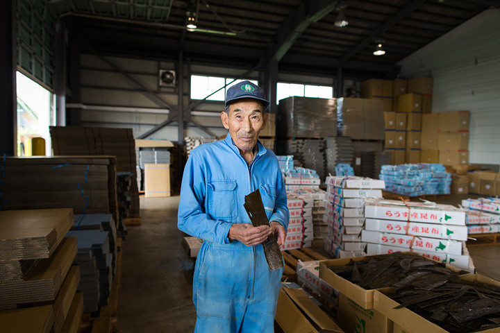 昆布仓库的老师傅,他送了我们几片干昆布,掰下来一片放在嘴里含着都很有味道,鲜美极了。