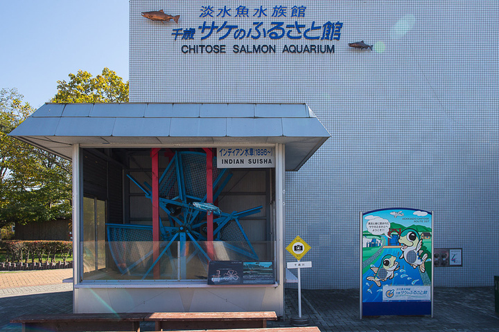 早期的水车,已经有百年历史,成了文物,展示在千岁川的河边。