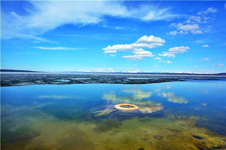 小伙伴们千万别错过这个景点!West Thumb,因何得名?整个黄石湖的形状就像一只手,所谓西拇指是黄石湖西边类似大拇指形状的一片水域。我惊奇的发现,在这湛蓝天空之下,湛蓝湖水边,居然还坐落着大大小小的彩池。当我走上West Thumb Geyser Basin的trail,立刻被眼前的美景惊呆了。。。远眺,是蓝天碧水,冰川雪山,如此磅礴大气,近看,则烟雾缭绕,五彩缤纷,如此秀美迷人,大自然的截然不同的美景就这样突兀而又和谐的融为一体。这里,该是黄石里我最爱的地方啦。一半海水,一半火焰,哦不对,是一半冷湖,一半热泉,远处是雪山,眼前是彩池 。甚至有湖中池,有人说以前钓了鱼直接丢进这个小洞中烫熟,吃新鲜的,真是感觉萌萌哒。