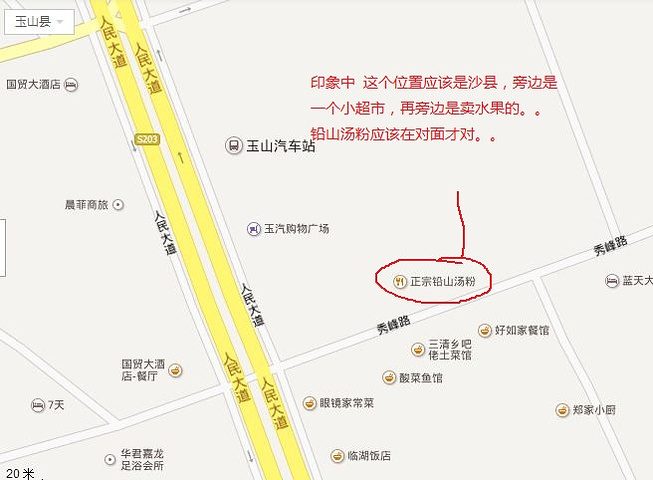 玉山汽车站旁边的 秀峰路 ,在那里找到一家“正宗铅山汤粉”,旁边是什么瓦罐汤,对面是沙县(当时还真想试一下江西的沙县,哈哈)。。。一份汤粉6块钱,我朋友说完爆桂林米粉;一份饺子好像是5块,我觉得完爆沙县(可能是刚下火车肚子饿的原因吧)。。。饿的时候来一碗热汤面是非常幸福的。(来,壮士,干了这碗热翔)