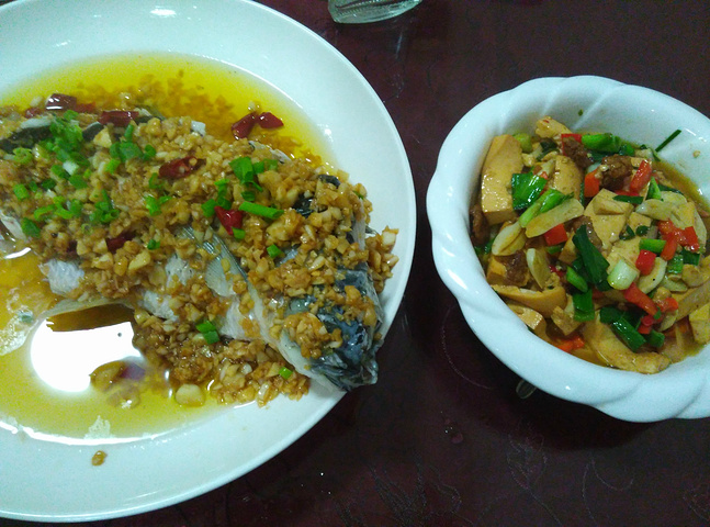 胡家菜(下山后的晚餐就在这解决)。。。两个人点了3个菜,这一餐用了67块,还是很实惠的。。。蒜香鱼38一例(这个不错),豆腐15,青菜12,餐具一套1块钱(相当于茶位1元/人吧)。当时还碰上搞活动,满58块送一瓶四特酒。虽然我不喜欢喝酒,但还是喝了小口,感觉不错,香。。。胡家菜没有菜单,老板娘会亲自带你看食材,你问她多少钱啊有什么材料啊炒还是蒸啊,她都很耐心。