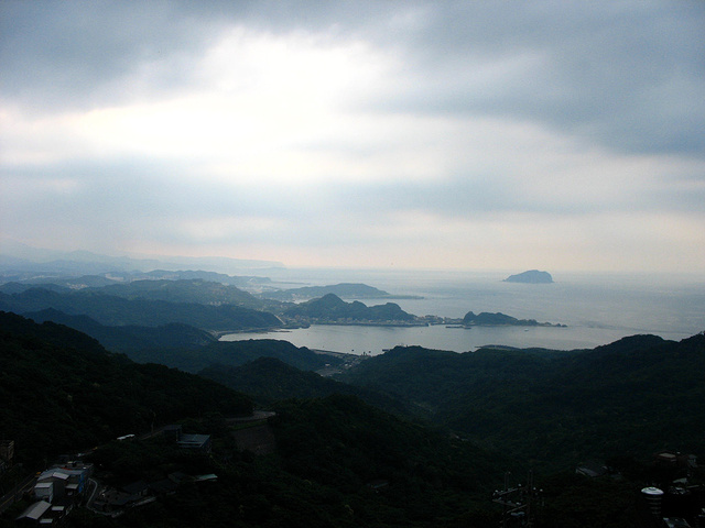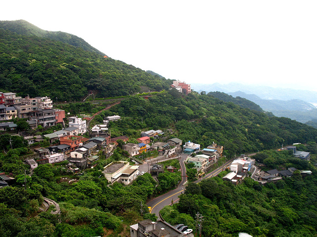 在九份茶坊前的瞭望台远眺基隆港,小城民居散布在山腰间。以此为据点,往左是五番坑方向,往右便是竖崎路了。