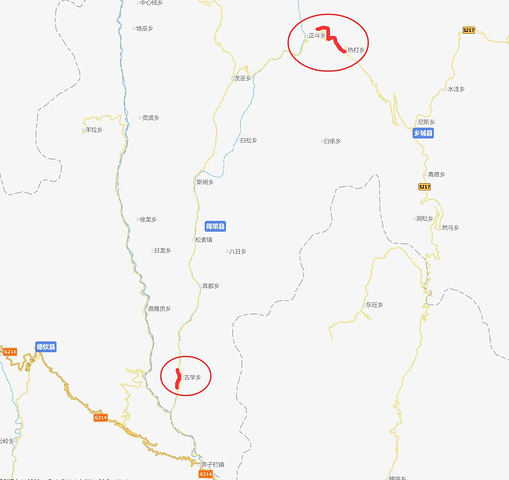 但是我所标识的两个圆圈路段都是塌方泥石流路段,十分不好走,建议不要走这条路,宁愿走318经过巴塘、芒康、德钦去香格里拉(特别是轿车)。