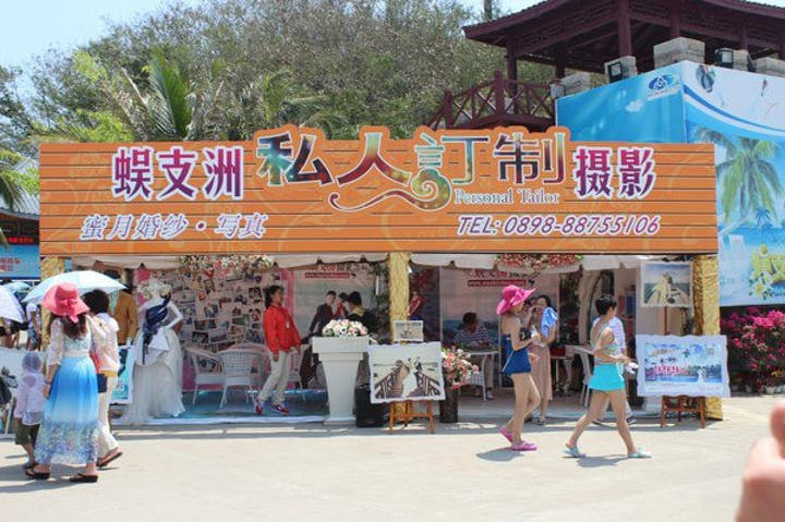 因为《私人订制》的关系,我俩对岛上的珊瑚酒店充满好奇,也想去看看明星拍电影时候使用的那个白帐篷。老公去潜水的时候,我就去拍摄婚纱那里打探消息去了(不要问我为什么不去潜水,我不会告诉你本小姐怕水的);继而,打算再次莅临……等老公潜水回来我们小小的商量了一下,婚纱照一定要一套蜈支洲岛上的海景!