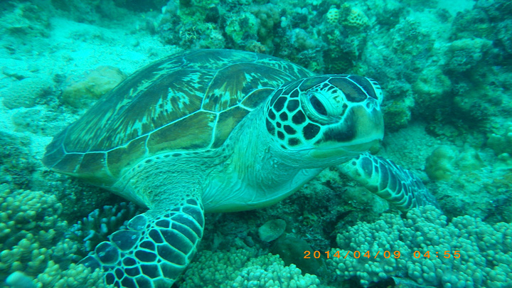 阿猪说,深潜有啥了不起,我浮潜也看到大海龟了,还趴在那里一动不动,Kye一个猛子扎下去,就停在它旁边使劲拍。