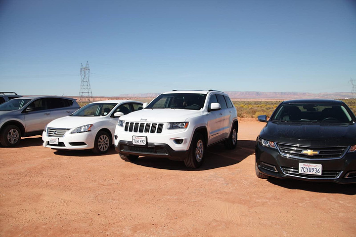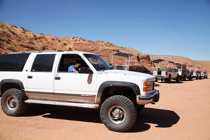 白色jeep是我们自己的车,到了印第安人的地点之后,必须把车停在他们停车场,然后搭乘专门的运输车去上羚羊谷,因为穿越那一小段沙漠是没有路的,所以对车的底盘和对司机的驾驶技术要求很高。