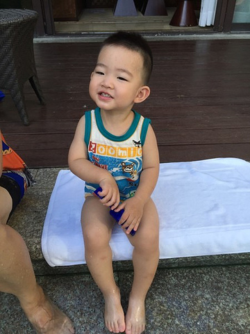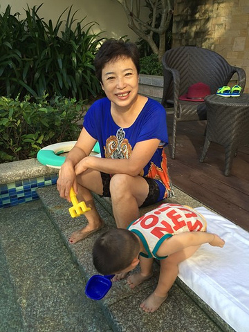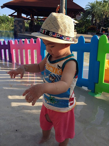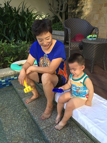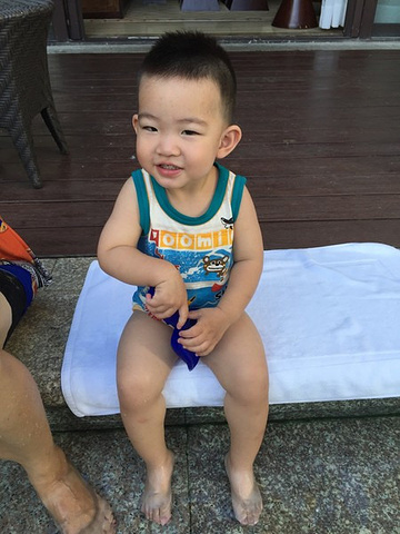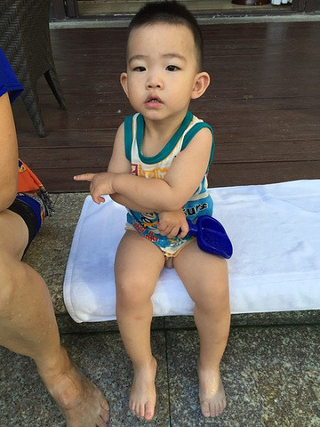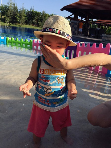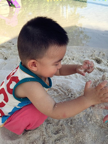 喝完椰汁我们去酒店的公共泳池转转,里面有个小的人工沙滩,沙子很白很细,比海滩的沙滩好,儿子光着屁股玩了一会儿,没敢让他久留,毕竟三亚的太阳还是很毒的,怕给他晒伤。