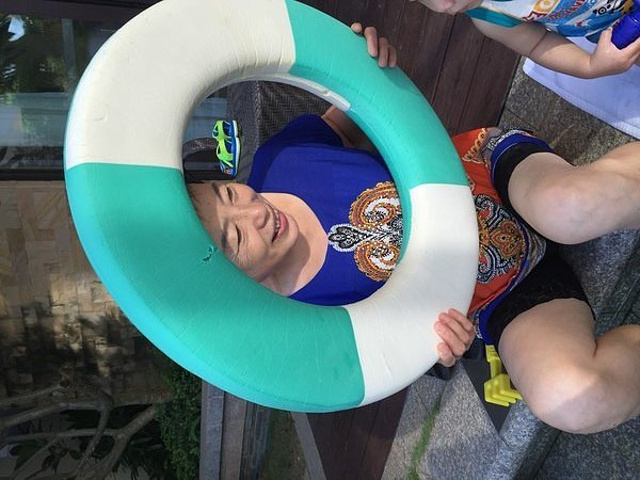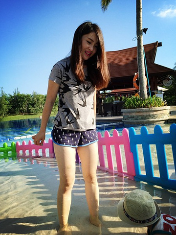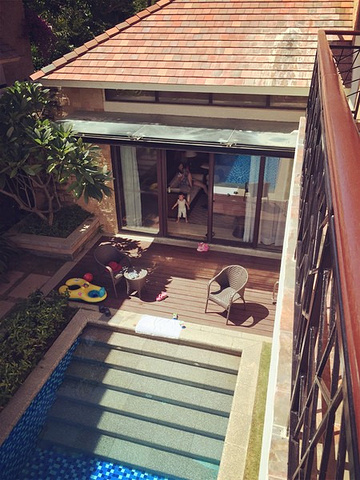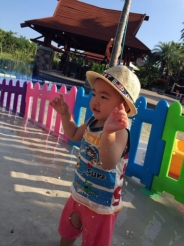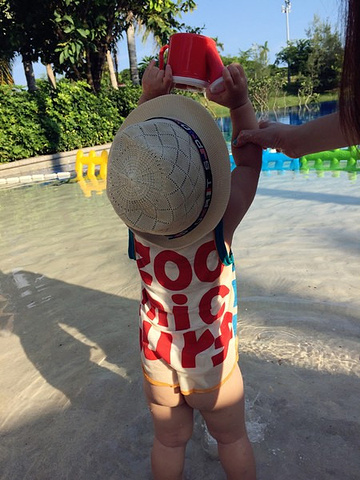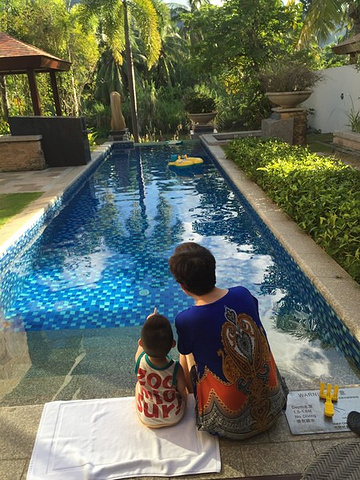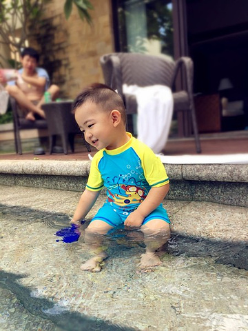 下午三点多太阳已经不那么厉害了,而且我们住的别墅区,可以遮挡一部分阳光,所以这会儿就可以下水玩了,不担心被晒到。如果不是这种带私家泳池的房间,要去公共泳池玩水的话,就很受约束,因为一整天都是很晒的,没办法下水。后来我们住到的天域酒店这点就很好,公共泳池有很大片的树荫可以遮阳,还有一个山洞型的泳池,白天都可以在水里面玩,不用担心小朋友晒伤。我想这可能就是很多人觉得天域适合亲子的地方之一。
