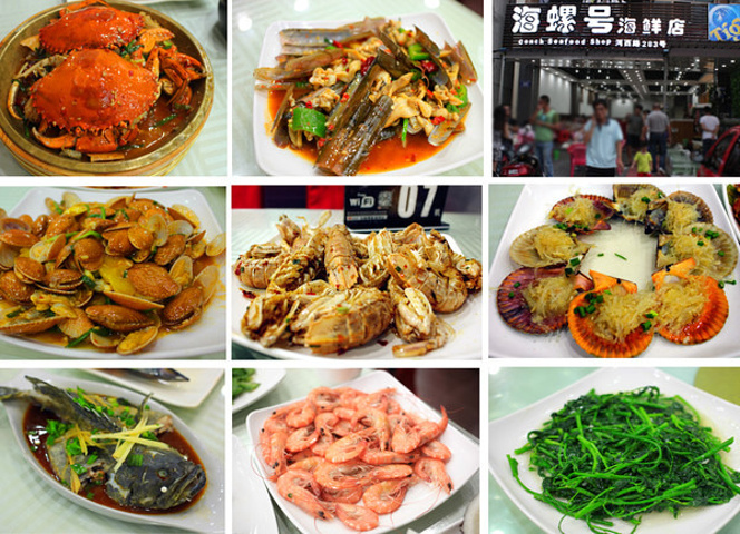 不知不觉到了晚饭时间,既然来了三亚,还是忍不住去吃海鲜,大部分人吃海鲜被宰其实都是因为在偏远或景点附近吃,我们去了三亚美食攻略推荐的海螺号海鲜店,在春园海鲜广场斜对面,那条街有很多海鲜店。海南四大名菜之一“和乐蟹”是他们的招牌菜,点了两只和乐蟹,秘制辣炒的和乐蟹味道很赞,还有其它很多海南的野生海鲜都是明码标价,收费都还算合理,像大芒果螺38一斤,皮皮虾90元一斤,石斑鱼98元一斤,还都是包含了加工费的。小家伙不能吃辣的,粉丝、石斑鱼、虾、和青菜是没有辣椒的,虾帮他剥好,鱼基本没什么刺,仔细挑一下就可以了,然后和饭伴一起给他吃,很乖的吃了一碗饭,值得一提的是店内竟然还有BB椅,很受妈妈们的欢迎啊