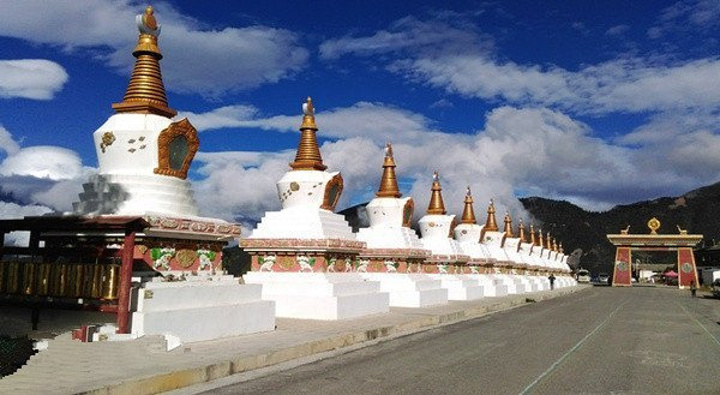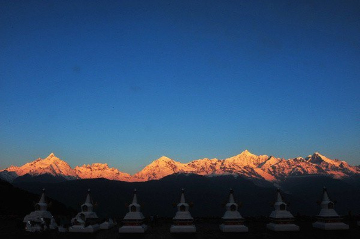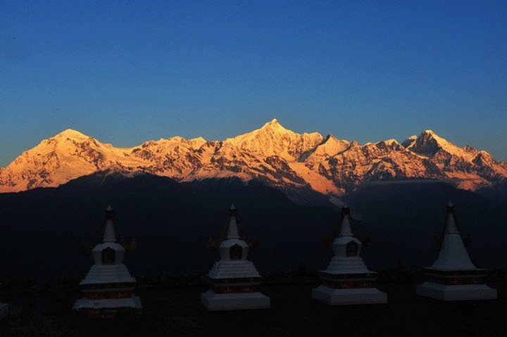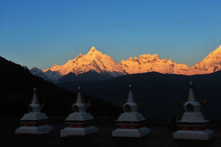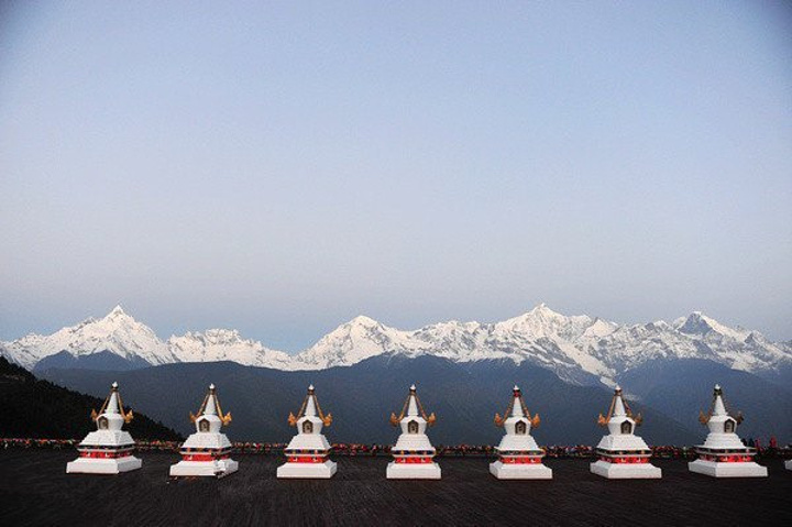 在飞来寺也有一个比在迎宾台更大的一个观景台,这里供奉着八座洁白的佛塔,从观景台可以将这一排整齐的佛塔与梅里雪山同时拍下来,这也是拍摄梅里雪山最经典的角度。