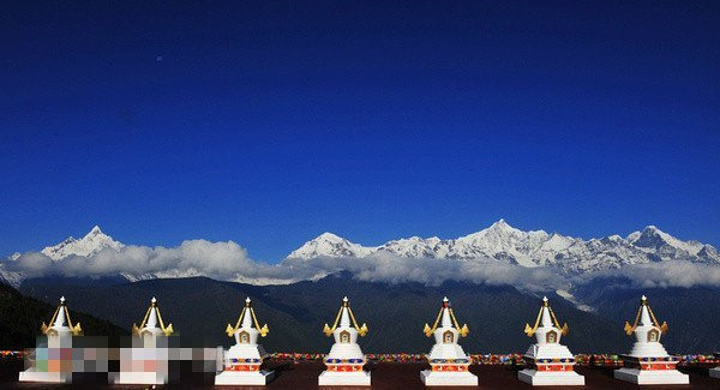蓝天下的梅里十三峰,神山前的云带就象献给神山的洁白的哈达,洁白的佛塔与圣洁的雪山交相辉映。