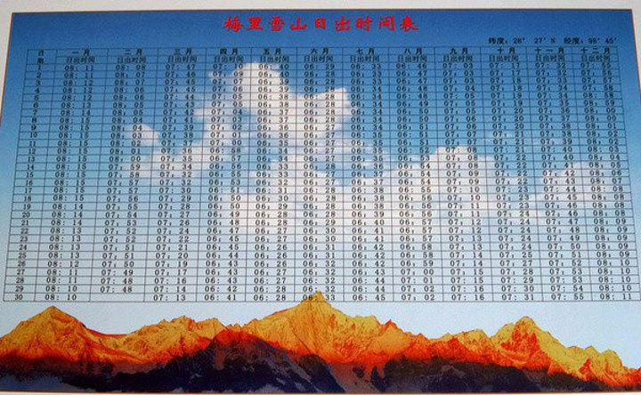 欣赏梅里雪山璀璨的星空,再美美的睡上一觉,期待第二天早晨欣赏到更加震憾的梅里雪山日照金山。梅里雪山日照金山出现的时间每月每天的都不一样,这里有一张梅里雪山的日出时间表,这样大家可以根据自己所到达的日期,来决定几点起床欣赏日出。
