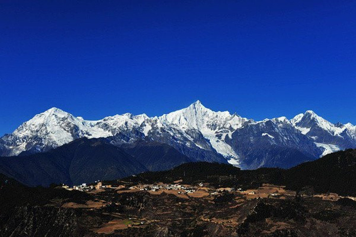 十三迎宾塔观景台也是欣赏梅里雪山的最佳位置之一,雄伟的梅里雪山耸立在蓝天下,气势磅礴、震憾无比。
