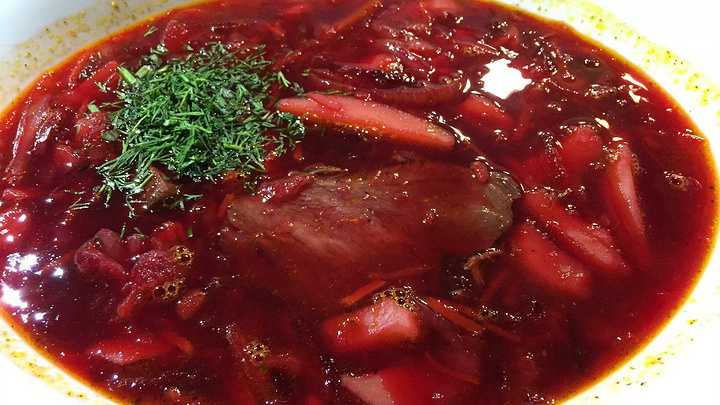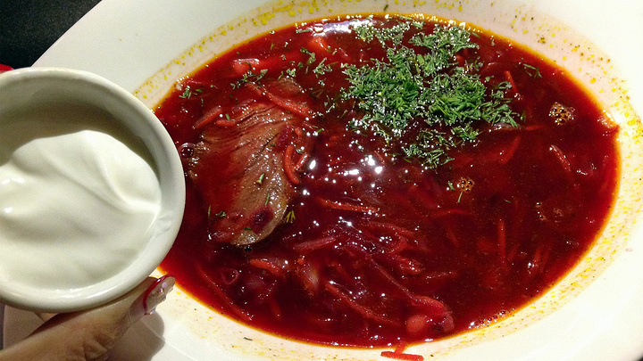 罗宋汤 борщ:俄国最具代表性的传统汤品。推荐淋上酸奶油一起享用,更能尝出罗宋汤的美味精髓。口感一流哦,不过刚开始第一口吃不习惯,慢慢的就“食过翻寻味”(粤语)了