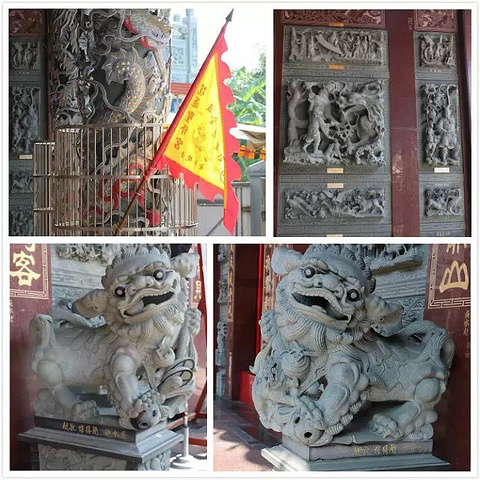 镂空雕刻的石柱子和庙门装饰以及庙门前的一对石狮。